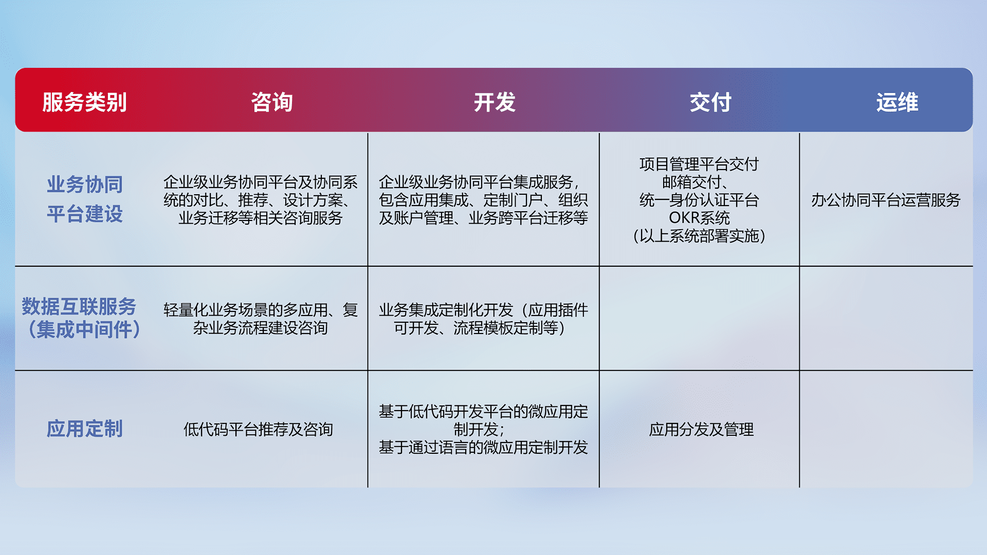 针对钉钉、、、企微、、、IDaas等平台级产品提供产品的规划、、、方案、、交付、、定制化开发等服务,,实现如统一协同办公、、、智能客户服务、、、、混合会议管理、、智能数据查询、、、等业务场景,,,,实现数字化转型。。